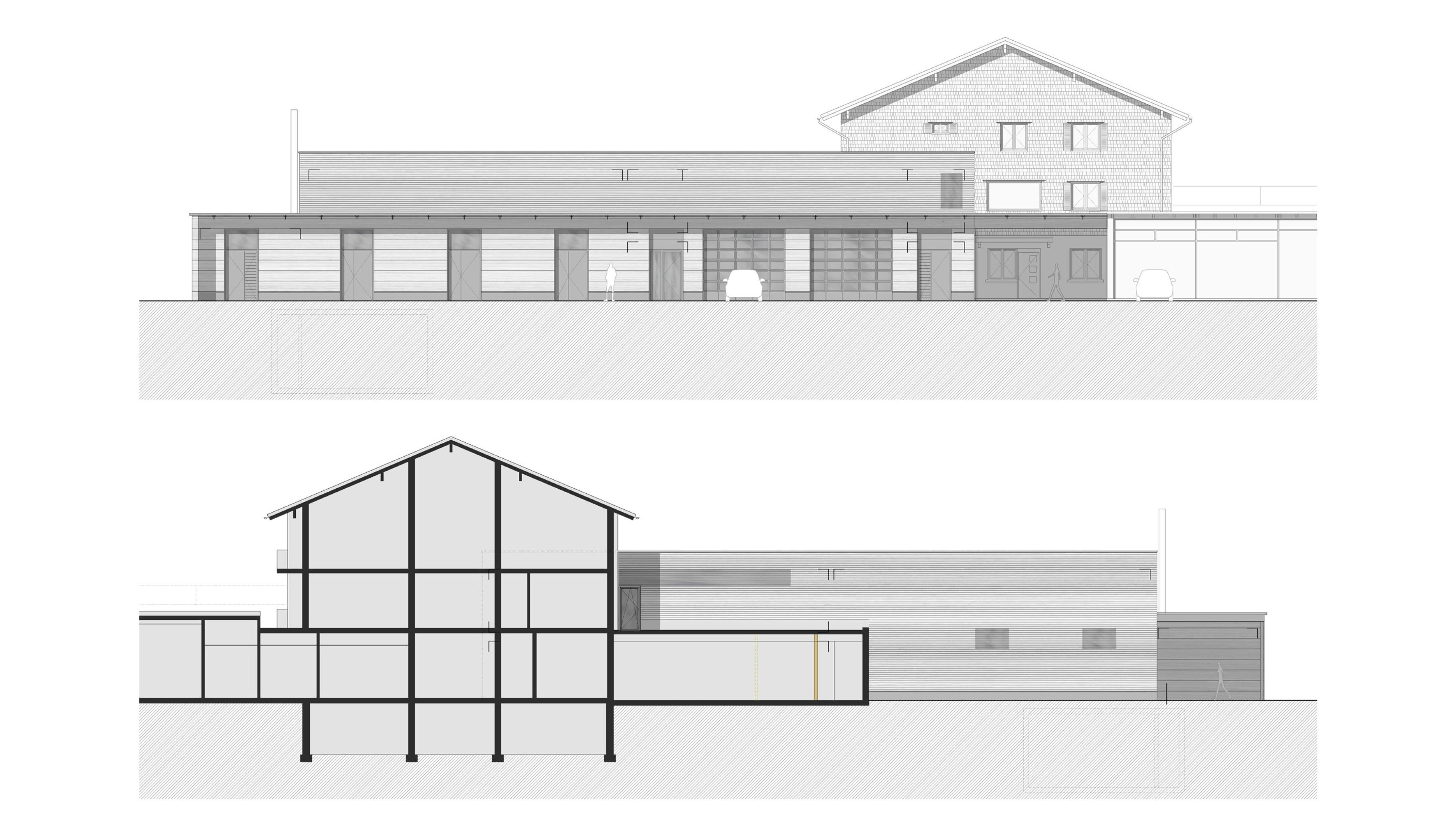 Beim Zubau werden die erdberührten Bauteile in Massivbauweise ausgeführt. Die Tragkonstruktion der Werkstätte wird in konstruktiver Holzbauweise errichtet. Die Fassade wird als Holzfassade ausgeführt.